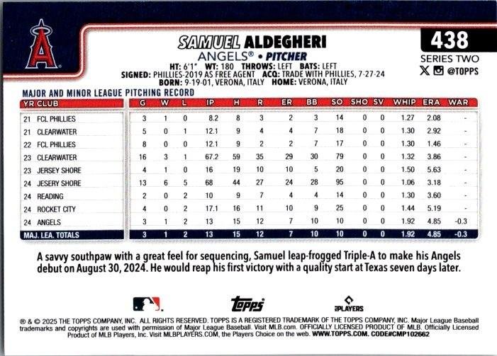 In 2025 Samuel Aldegheri played for the Los Angeles Angels.