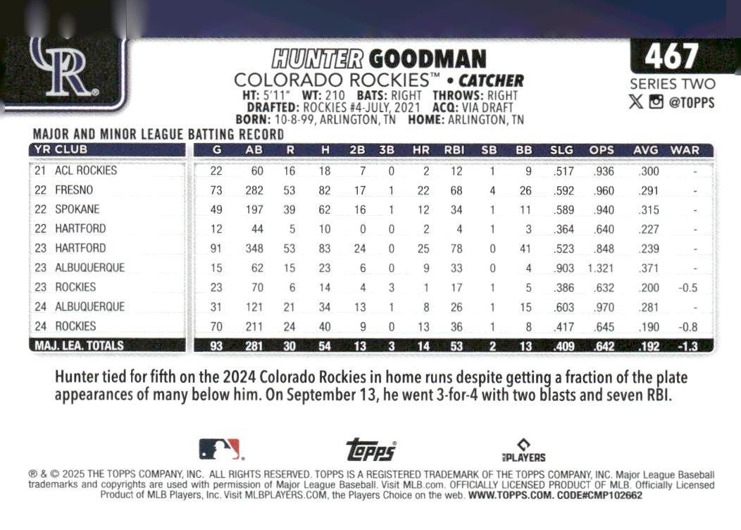 In 2025 Hunter Goodman played for the Colorado Rockies.