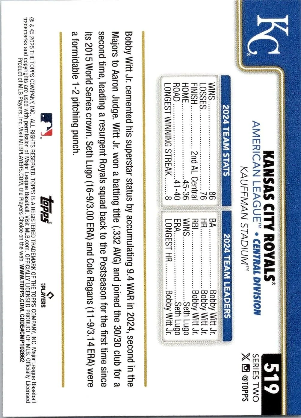 This is a nice example of a 2025 Topps #519 Kansas City Royals