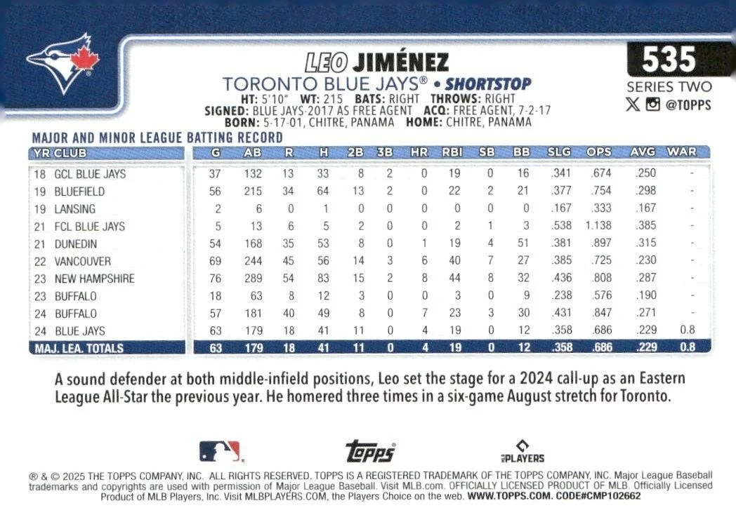 This is a nice example of a 2025 Topps #535 Leo Jiménez