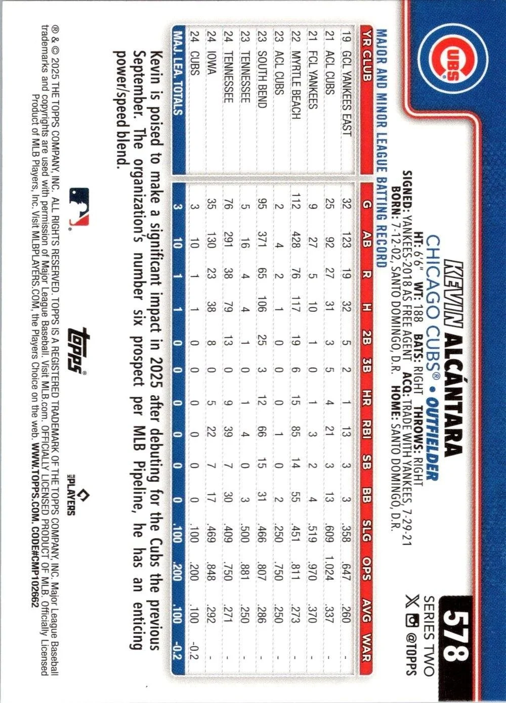 This is a nice example of a 2025 Topps #578 Kevin Alcántara