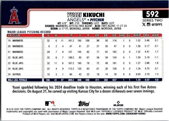 This is a nice example of a 2025 Topps #592 Yusei Kikuchi