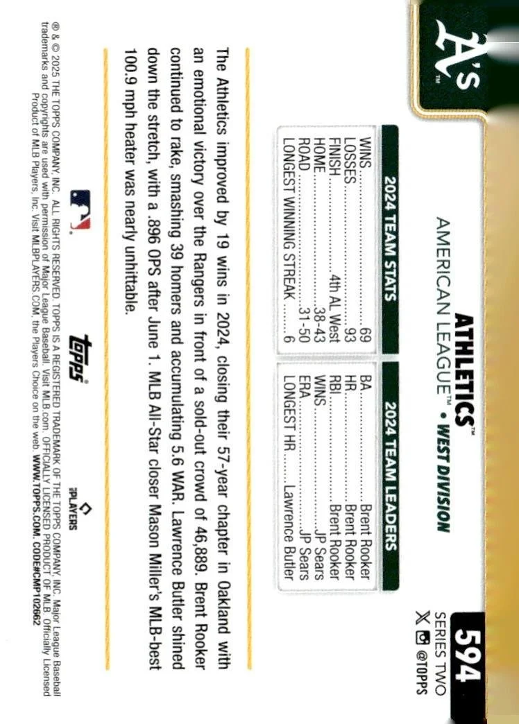 This is a nice example of a 2025 Topps #594 Athletics