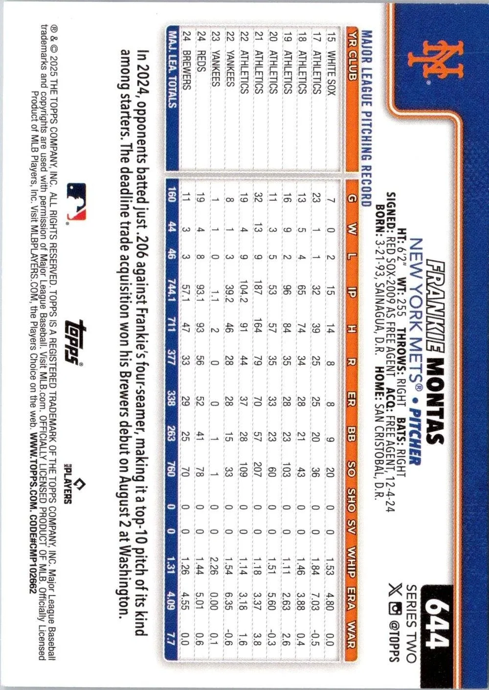 This is a nice example of a 2025 Topps #644 Frankie Montas