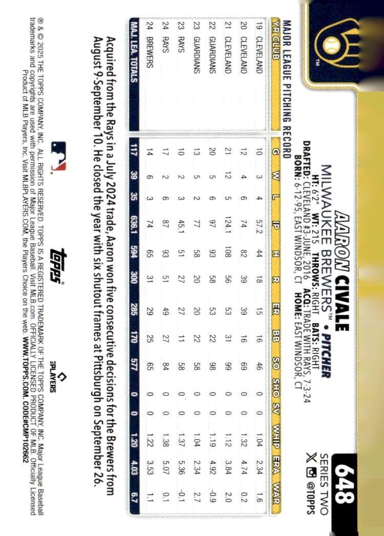 This is a nice example of a 2025 Topps #648 Aaron Civale