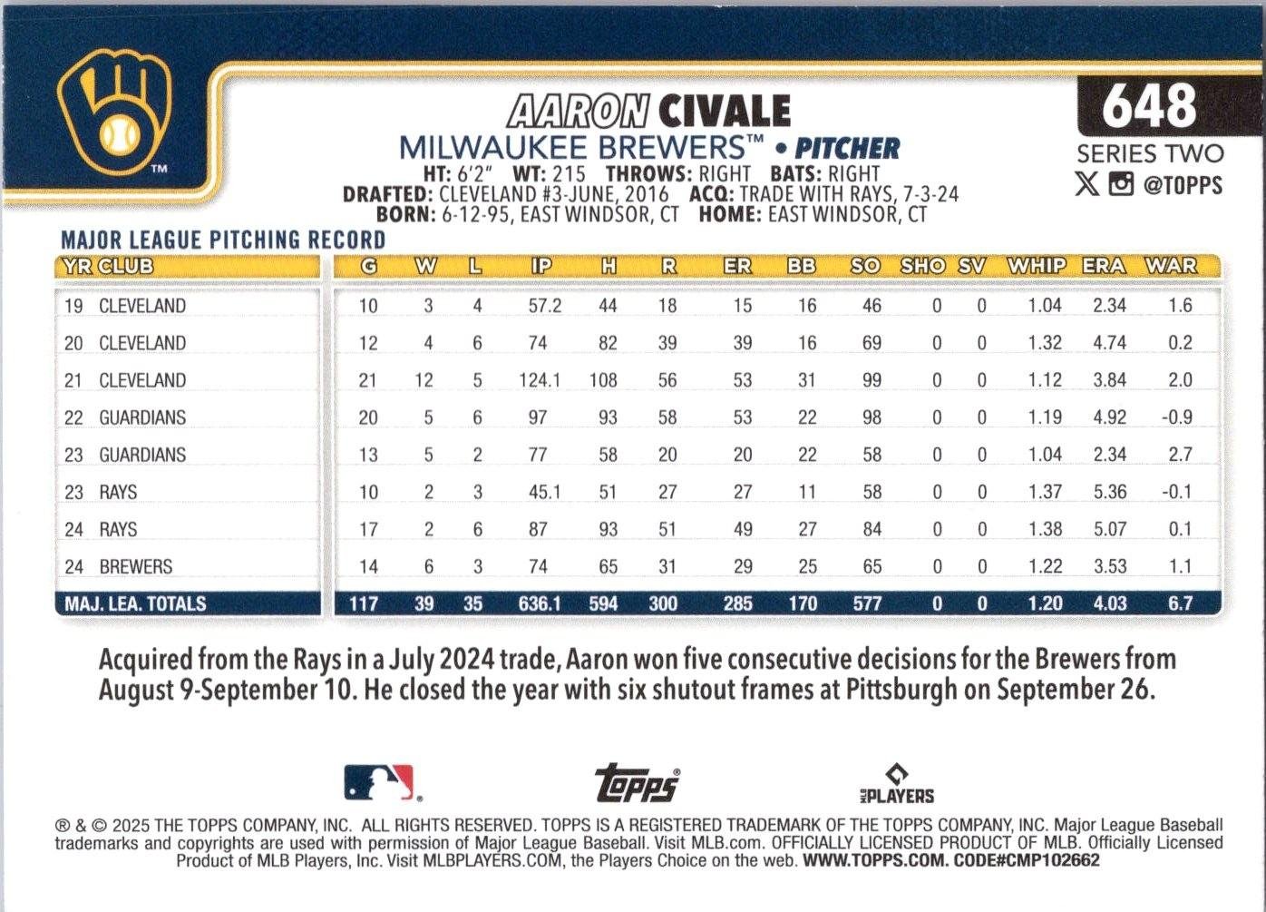 In 2025 Aaron Civale played for the Milwaukee Brewers.