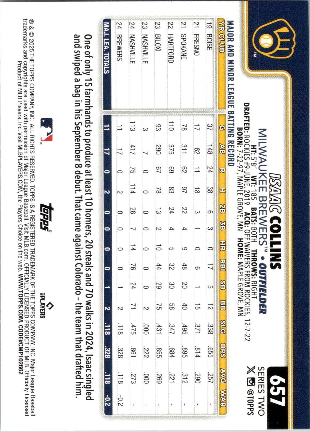 This is a nice example of a 2025 Topps #657 Isaac Collins