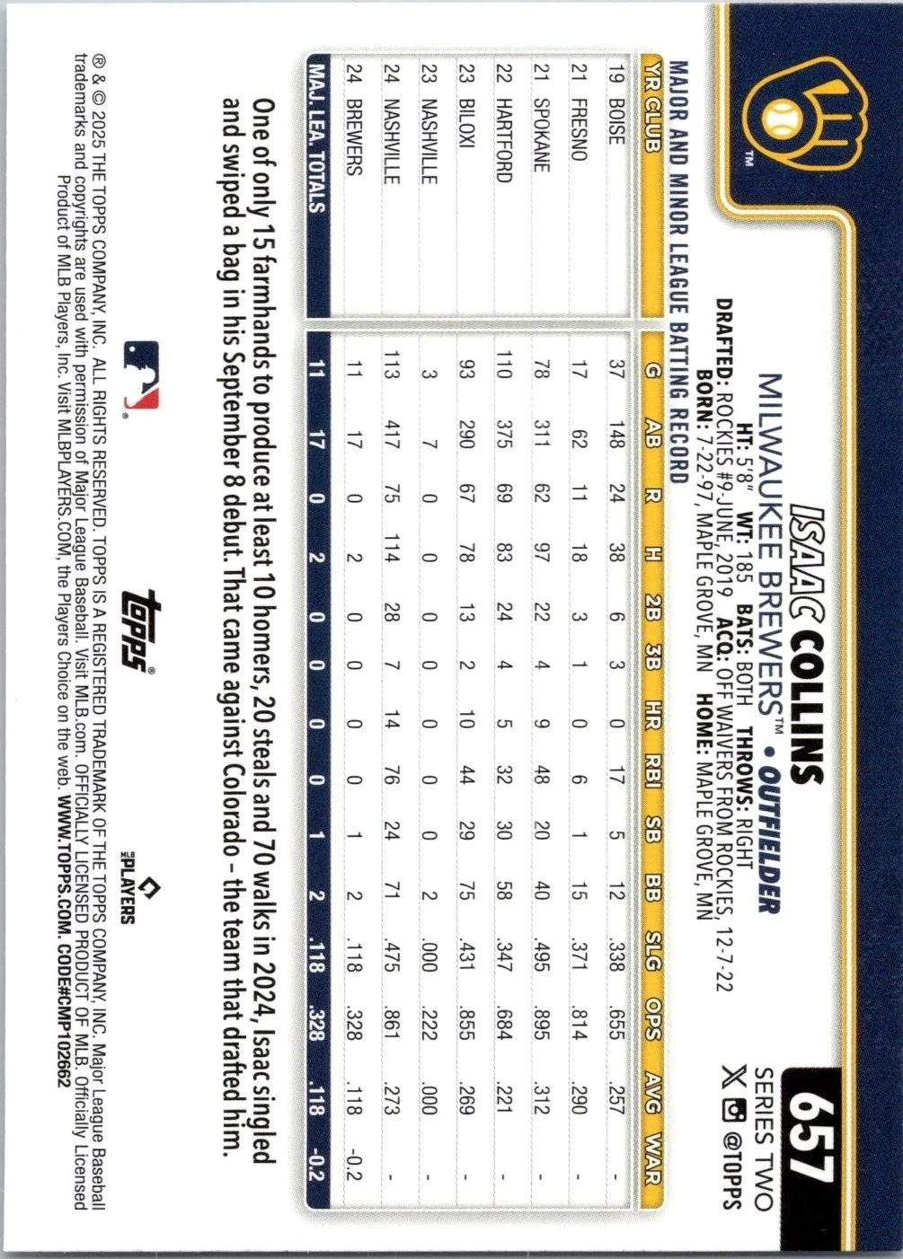 This is a nice example of a 2025 Topps #657 Isaac Collins