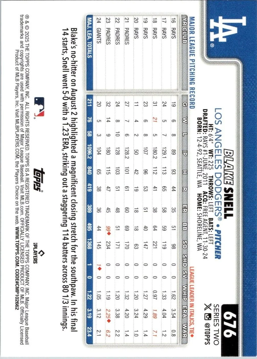 In 2025 Blake Snell played for the Los Angeles Dodgers.