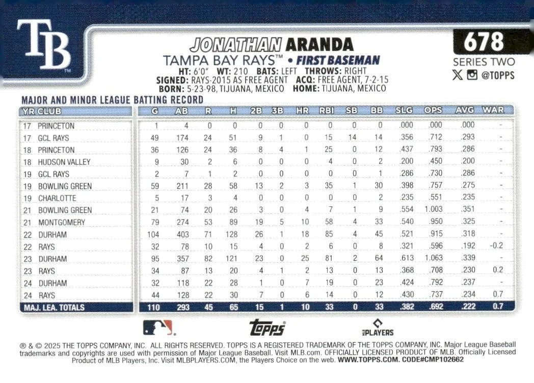 This is a nice example of a 2025 Topps #678 Jonathan Aranda