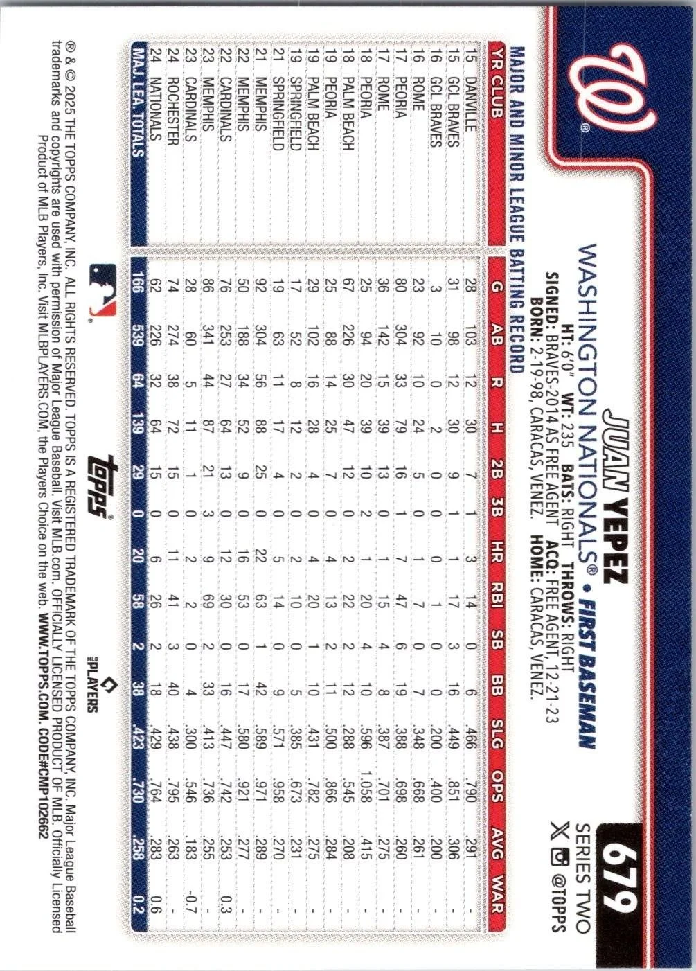 This is a nice example of a 2025 Topps #679 Juan Yepez