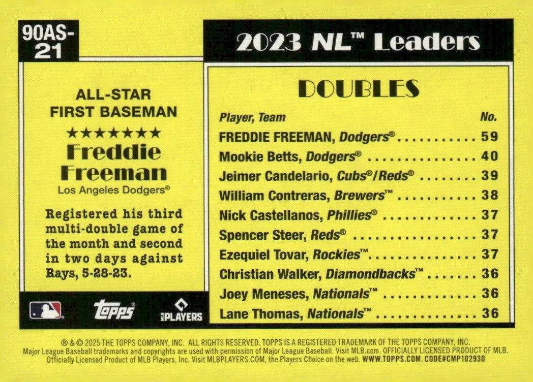 This is a nice example of a 2025 Topps #90AS-21a Freddie Freeman 1990 Topps Baseball 35th Anniversary All-Stars