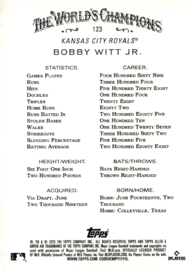 This is a nice example of a 2025 Topps Allen & Ginter #123 Bobby Witt Jr.