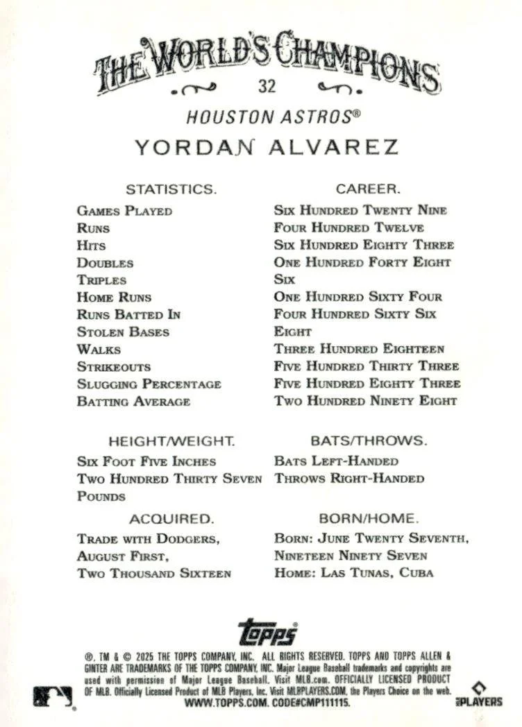This is a nice example of a 2025 Topps Allen & Ginter #32 Yordan Alvarez