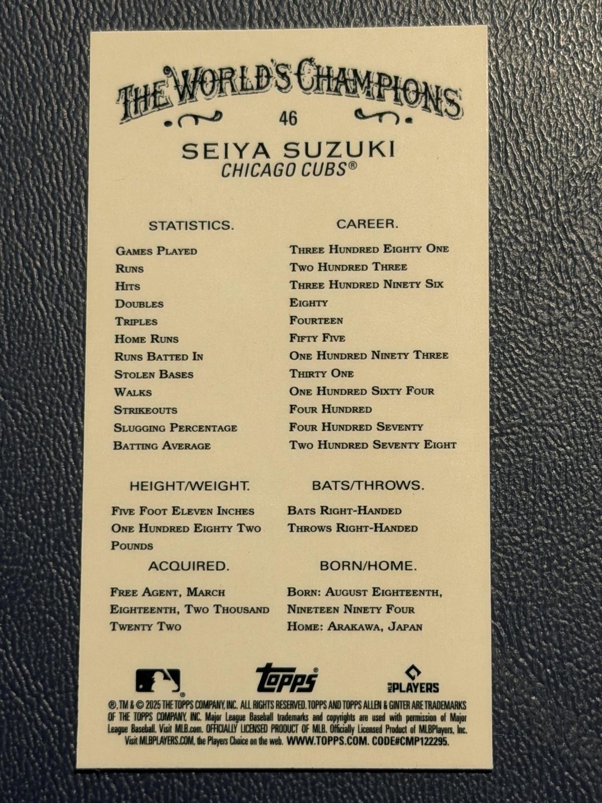 This is a nice example of a 2025 Topps Allen & Ginter #46 Seiya Suzuki Chrome Mini