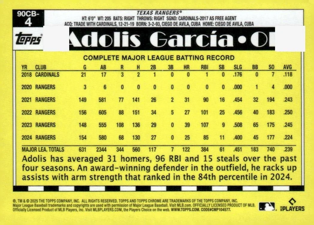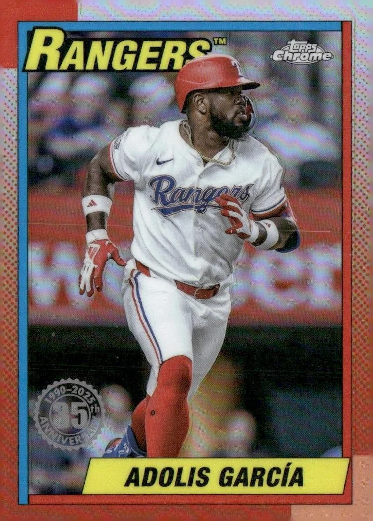 This is a nice example of a 2025 Topps Chrome - 1990 Topps Baseball 35th Anniversary #90CB-4 Adolis Garcia