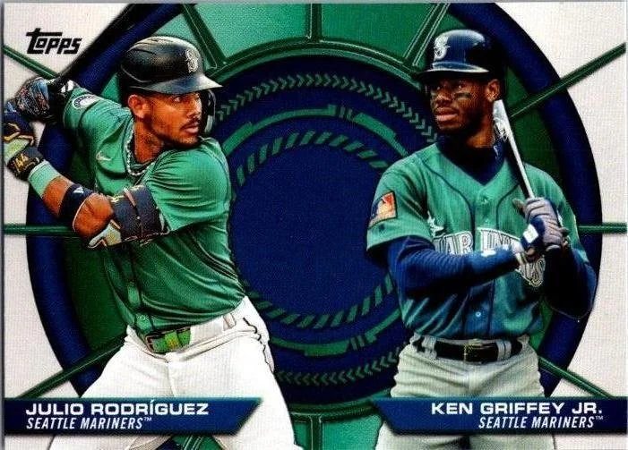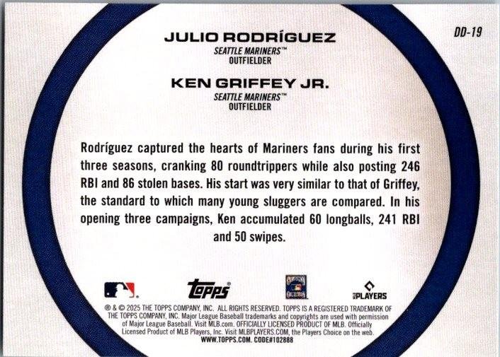 This is a nice example of a 2025 Topps #DD-19 Ken Griffey Jr. / Julio Rodríguez Dynamic Duos