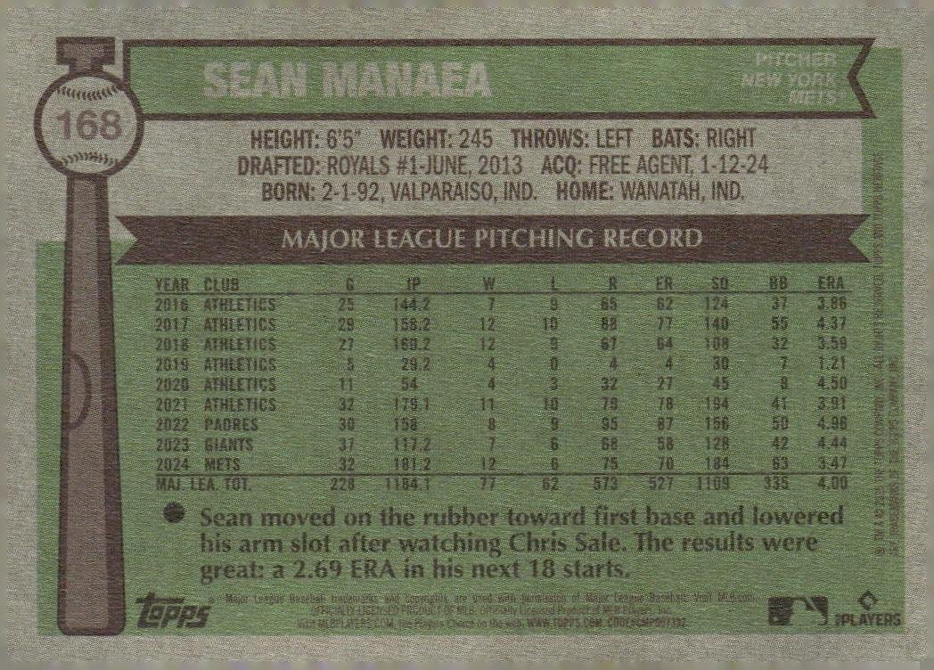 This is a nice example of a 2025 Topps Heritage #168 Sean Manaea Dark Green Border