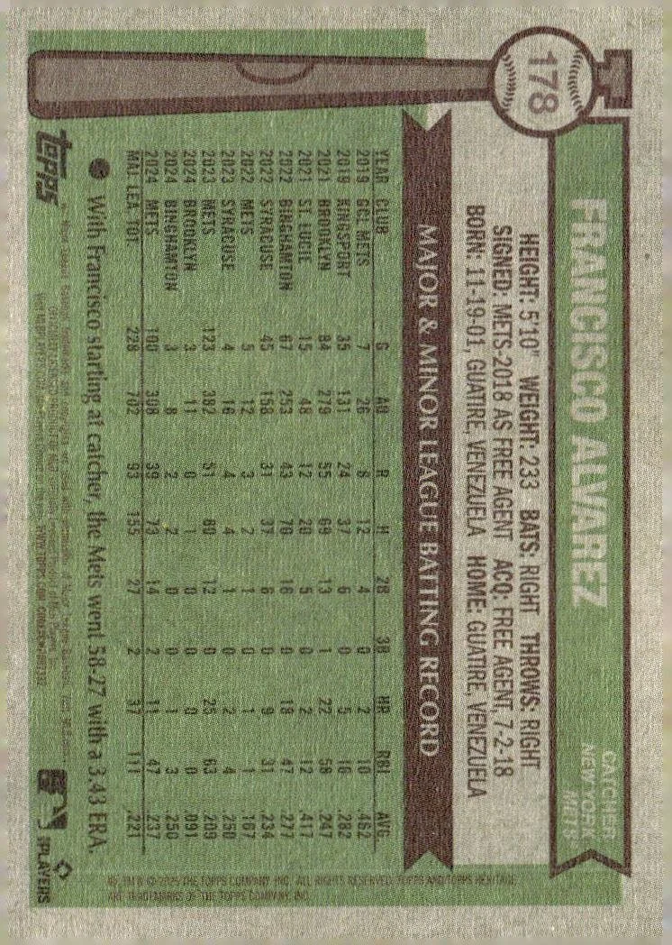 This is a nice example of a 2025 Topps Heritage #178 Francisco Alvarez