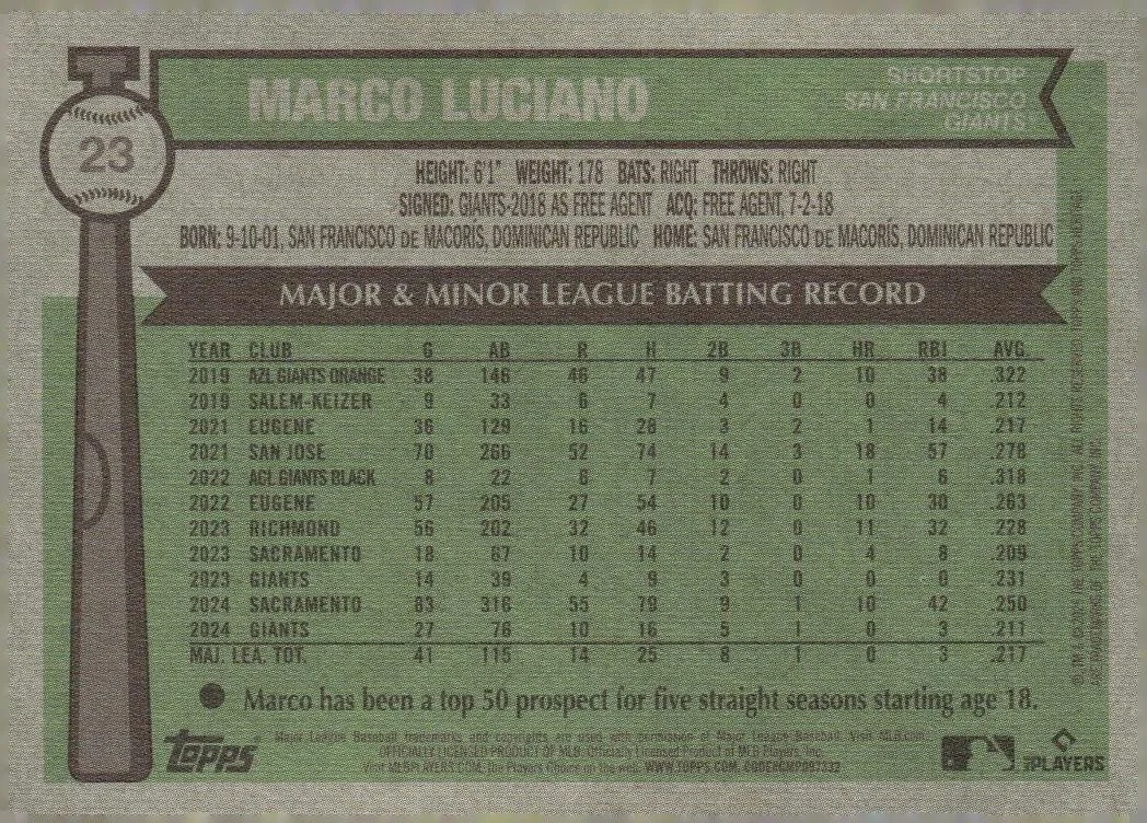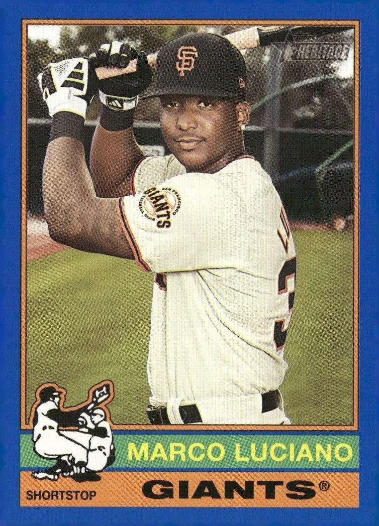 This is a nice example of a 2025 Topps Heritage #23 Marco Luciano Dark Blue Border