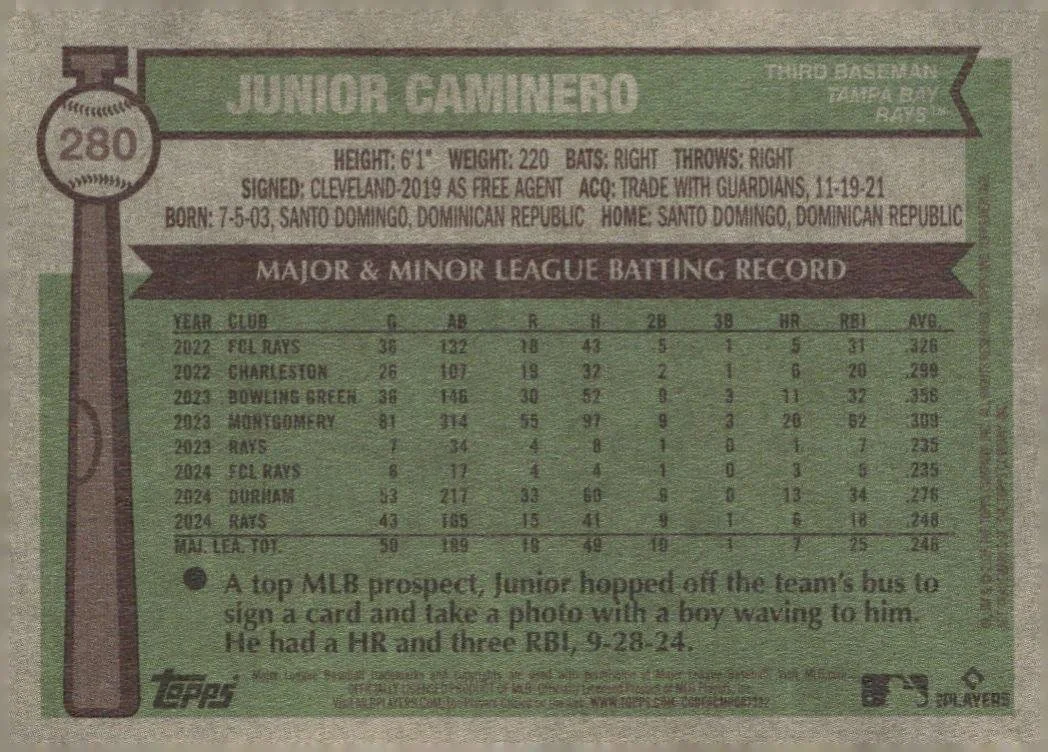 This is a nice example of a 2025 Topps Heritage #280 Junior Caminero
