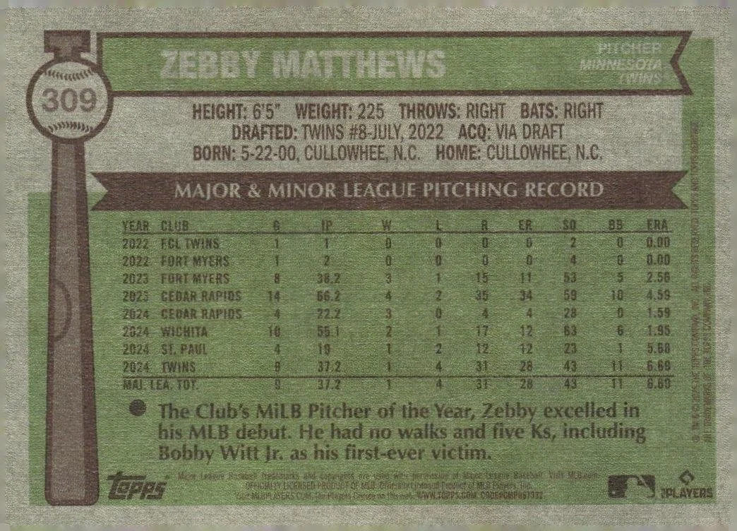 This is a nice example of a 2025 Topps Heritage #309 Zebby Matthews