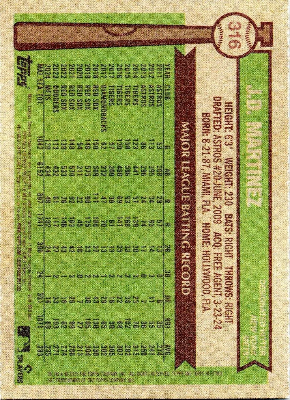 This is a nice example of a 2025 Topps Heritage #316 J.D. Martinez