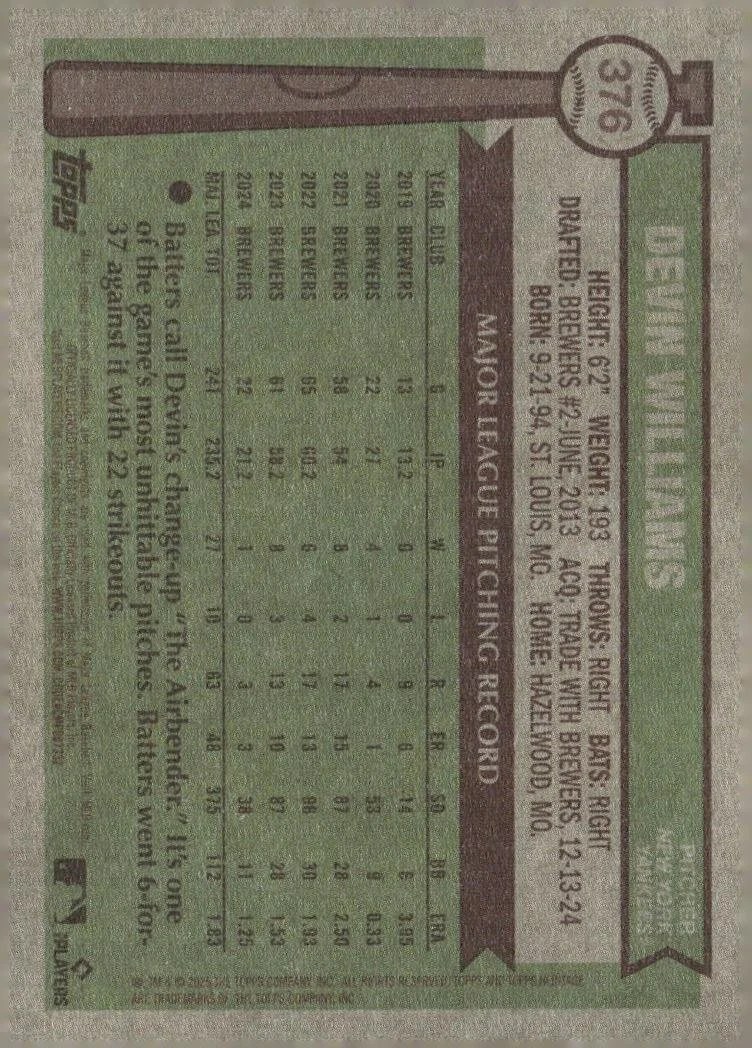 This is a nice example of a 2025 Topps Heritage #376 Devin Williams