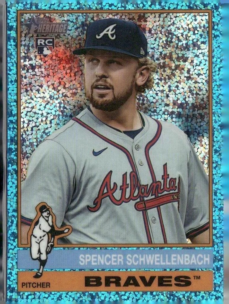 This is a nice example of a 2025 Topps Heritage #58 Spencer Schwellenbach Chrome Light Blue Sparkle Refractor