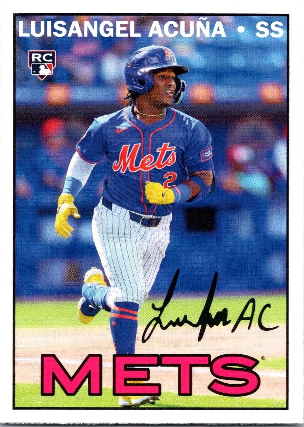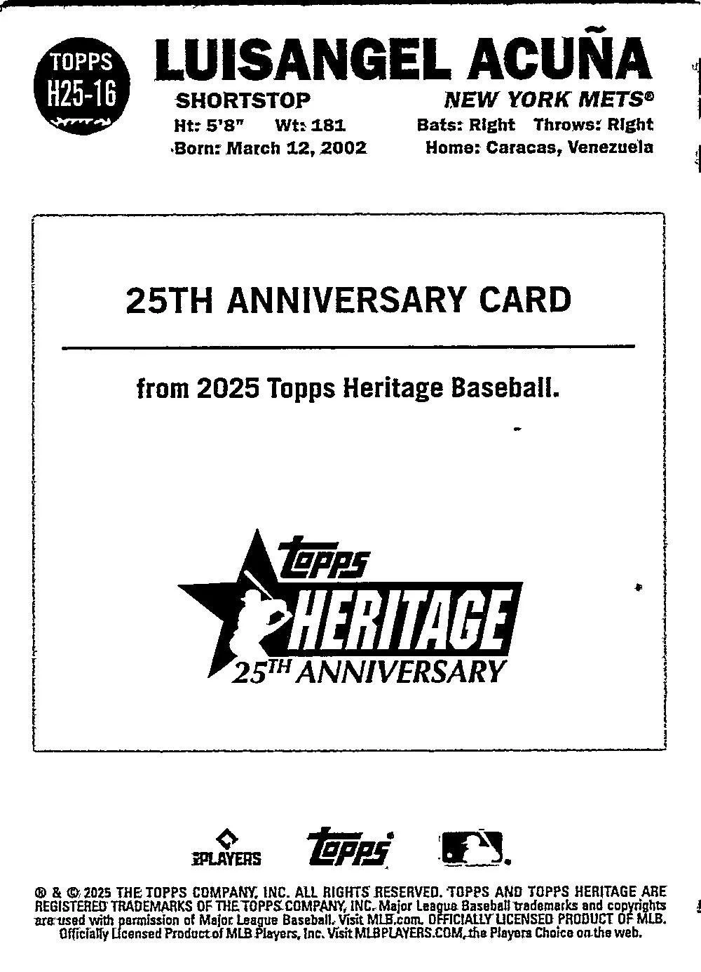 This is a nice example of a 2025 Topps Heritage #H25-16 Luisangel Acuña Heritage 25th Anniversary Holographic