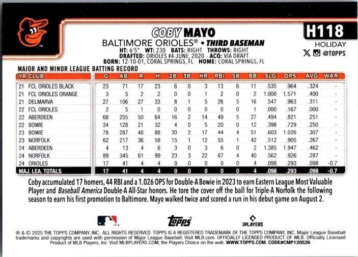 This is a nice example of a 2025 Topps Holiday #H118 Coby Mayo