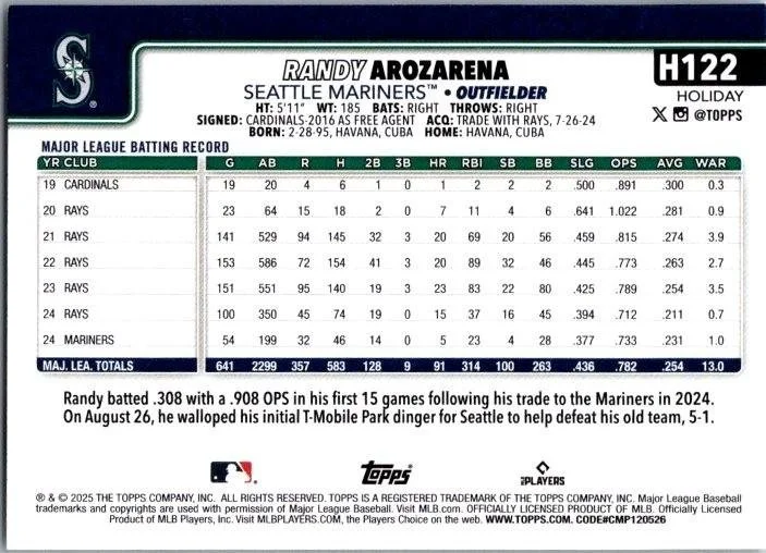 This is a nice example of a 2025 Topps Holiday #H122 Randy Arozarena