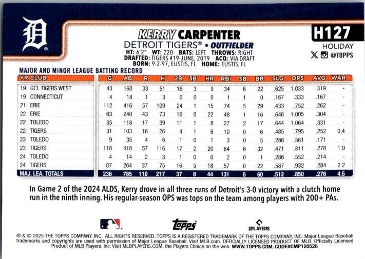This is a nice example of a 2025 Topps Holiday #H127 Kerry Carpenter