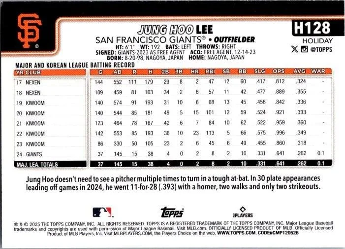 This is a nice example of a 2025 Topps Holiday #H128 Jung Hoo Lee
