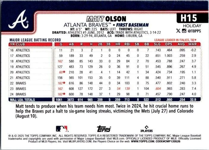 This is a nice example of a 2025 Topps Holiday #H15 Matt Olson