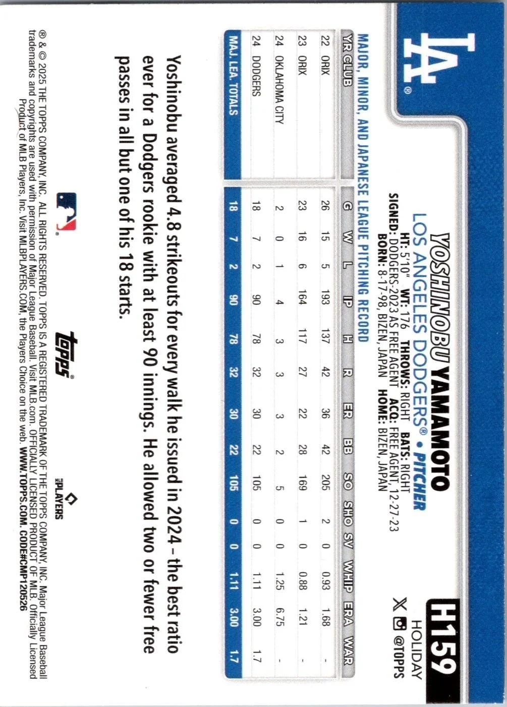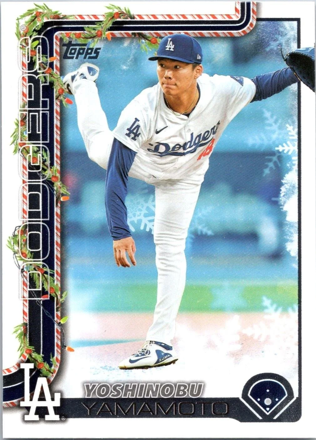 This is a nice example of a 2025 Topps Holiday #H159 Yoshinobu Yamamoto