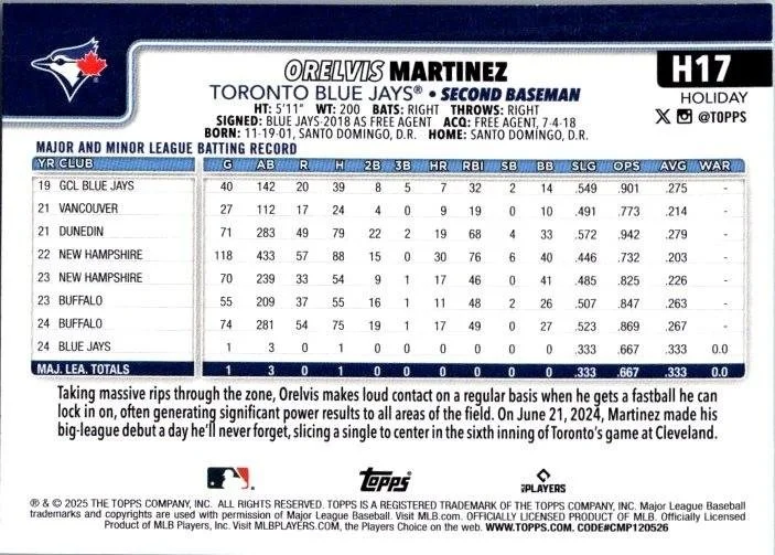 This is a nice example of a 2025 Topps Holiday #H17 Orelvis Martinez