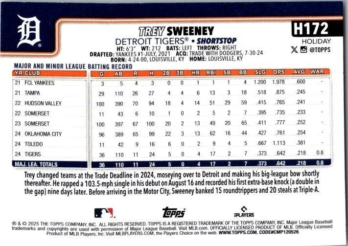 In 2025 Trey Sweeney played for the Detroit Tigers.
