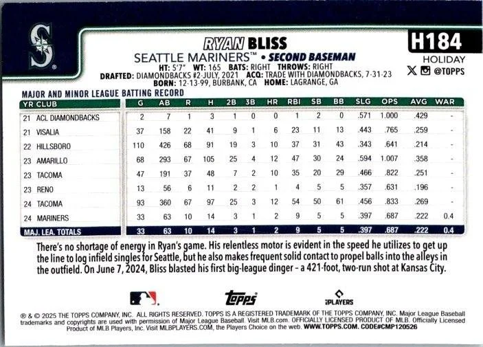 In 2025 Ryan Bliss played for the Seattle Mariners.