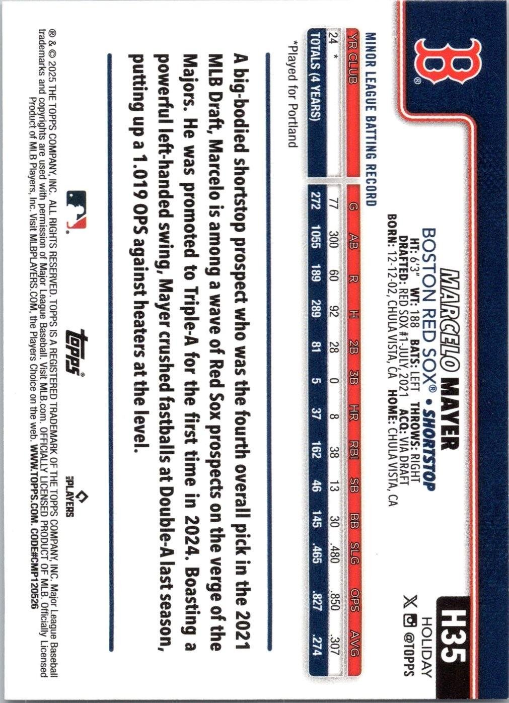 This is a nice example of a 2025 Topps Holiday #H35 Marcelo Mayer
