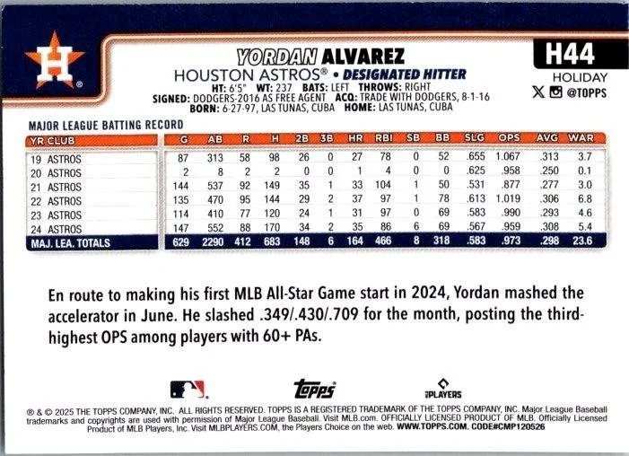 This is a nice example of a 2025 Topps Holiday #H44 Yordan Alvarez
