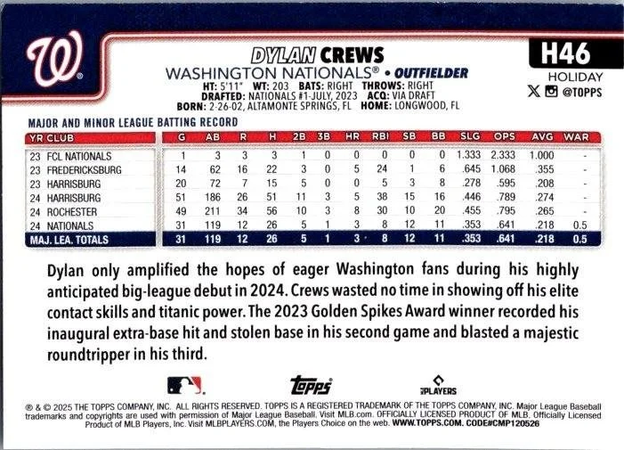 This is a nice example of a 2025 Topps Holiday #H46 Dylan Crews
