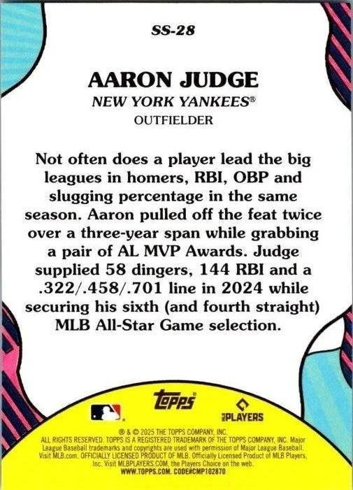 This is a nice example of a 2025 Topps #SS-28 Aaron Judge Summer Superstars