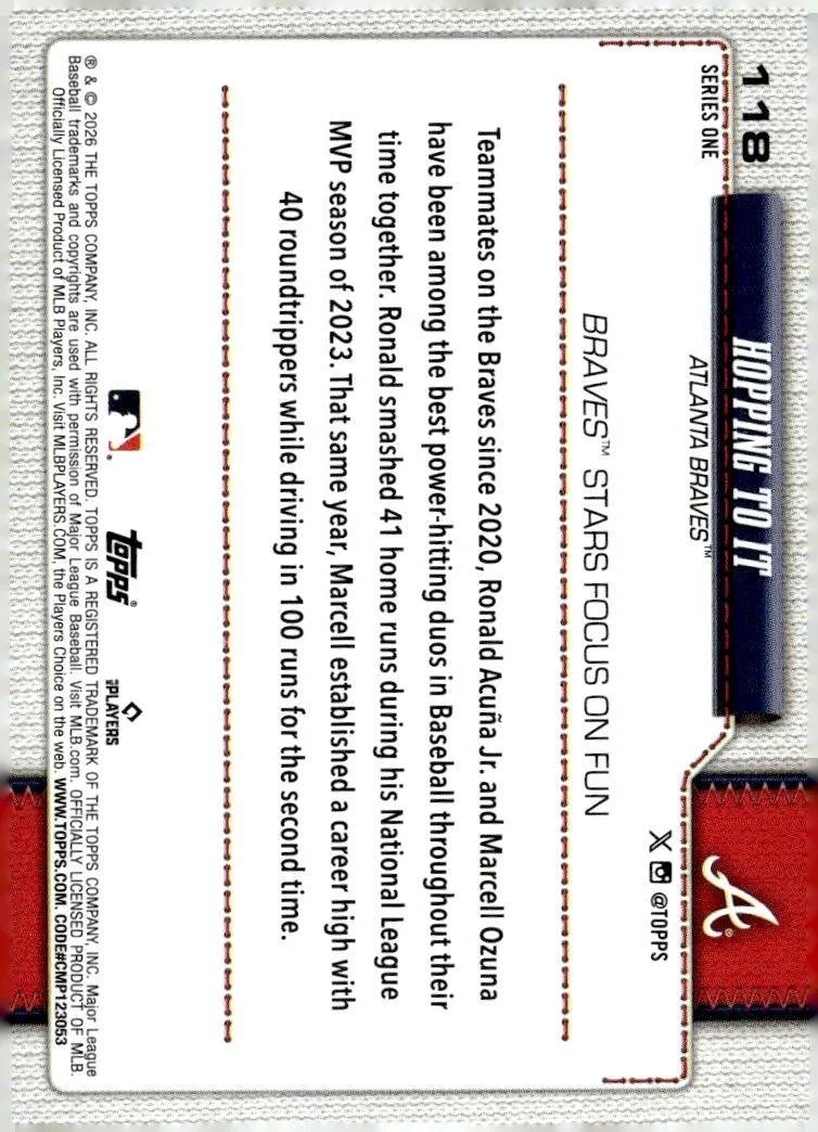 This is a nice example of a 2026 Topps #118 Hopping To It (Ronald Acuña Jr. / Marcell Ozuna)