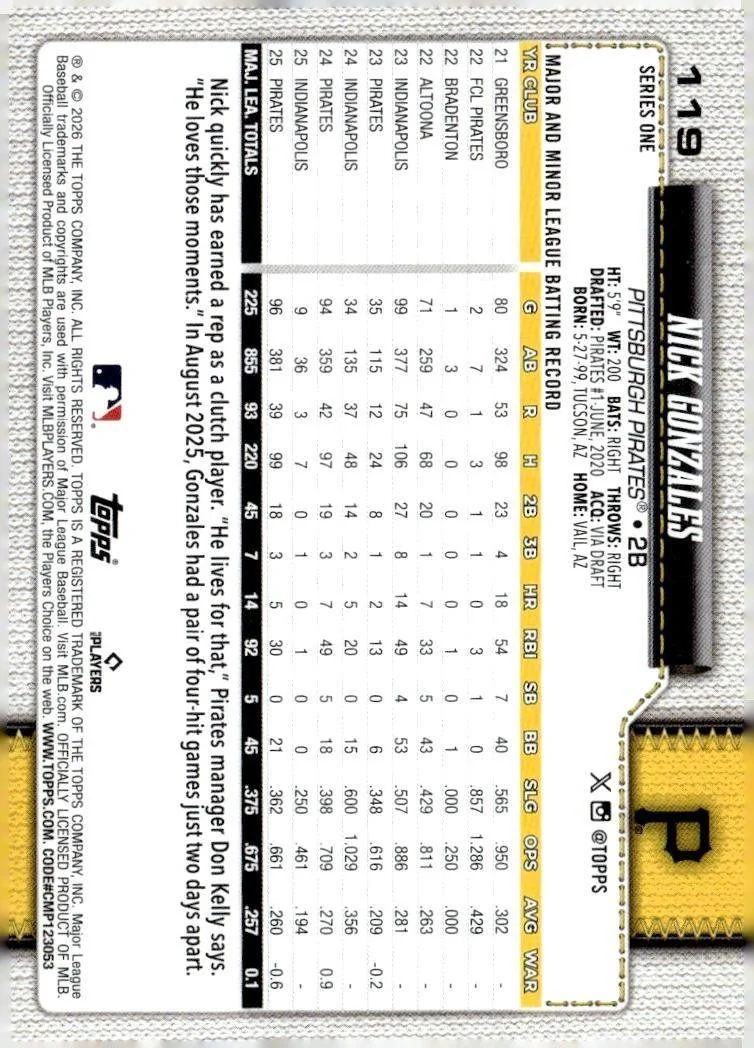 This is a nice example of a 2026 Topps #119 Nick Gonzales