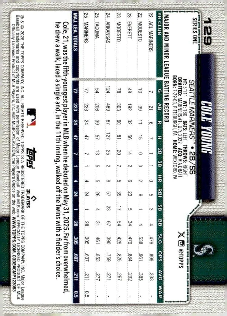 This is a nice example of a 2026 Topps #129 Cole Young