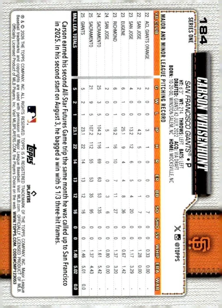 This is a nice example of a 2026 Topps #184 Carson Whisenhunt