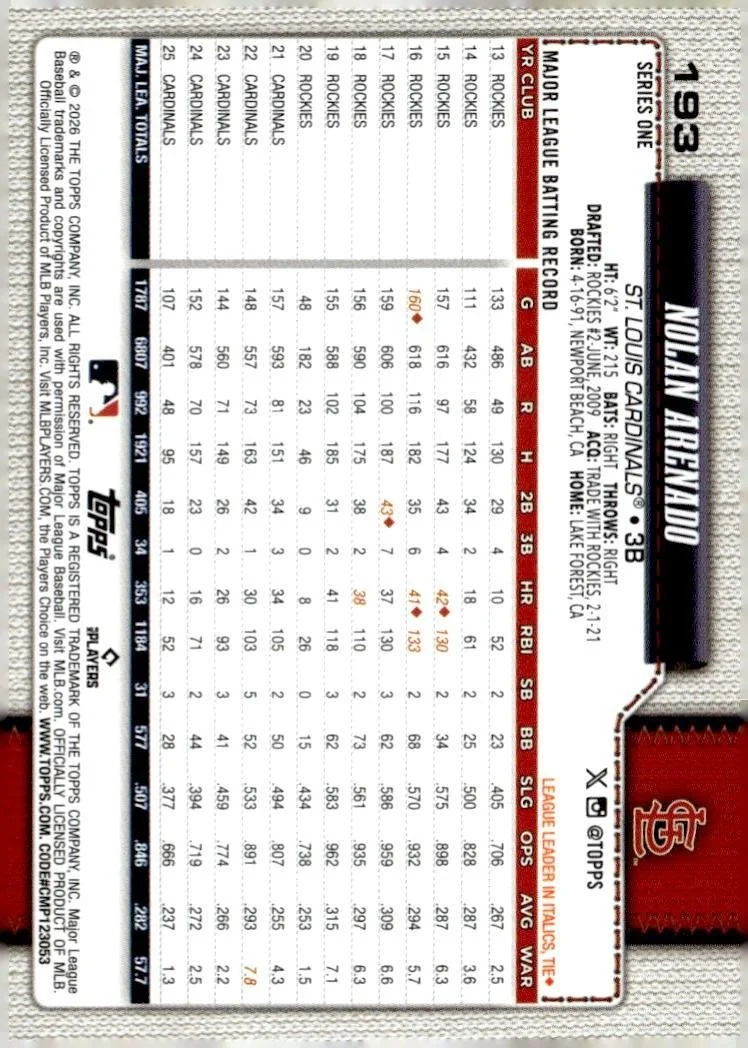 This is a nice example of a 2026 Topps #193 Nolan Arenado
