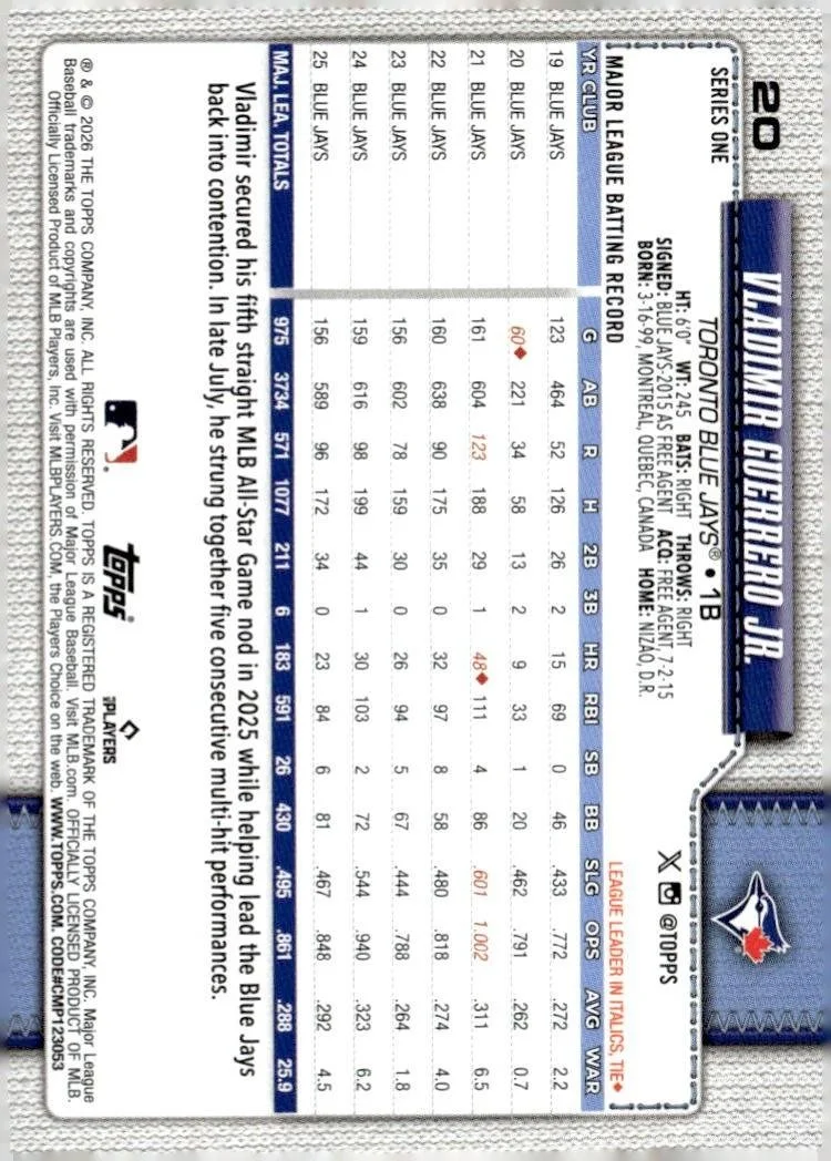 This is a nice example of a 2026 Topps #20 Vladimir Guerrero Jr.