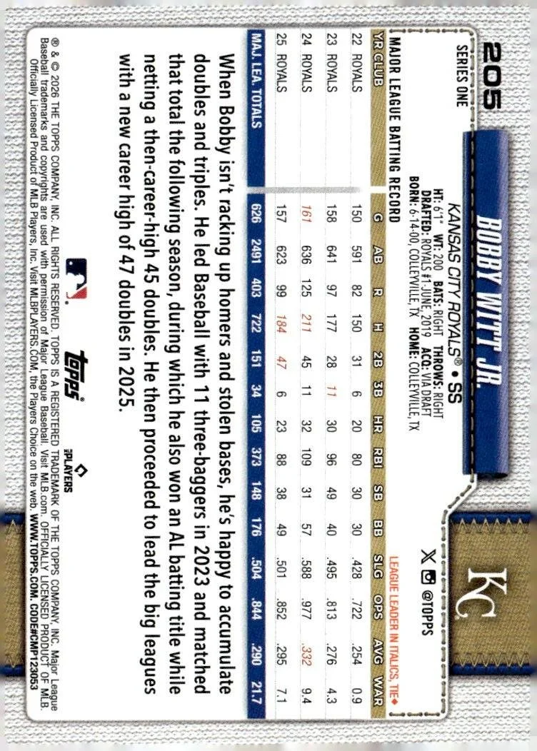 This is a nice example of a 2026 Topps #205 Bobby Witt Jr.